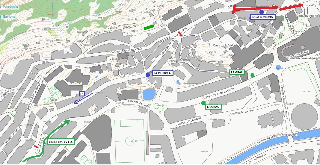 Les línies LM i LV de pujada seran desviades a l'Stela per la Baixada del Molí i Prat de la Creu, efectuant parada a la Grau on recolliran els usuaris de les parades de la Quirola i Casa Comuna i pujant pel c/ Dr. Vilanova recuperaran l'itinerari habitual.